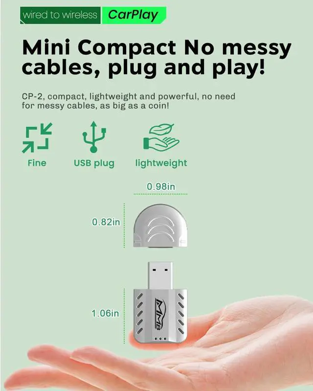 Extremely compact design 60% Smaller - MMB CP-2 MINI Wireless CarPlay adapter Whether it is a USB or Type-c port, almost all of them can be hidden in the port, blending seamlessly into your vehicles interior for a clean, Say goodbye to tangled cablesImprove driving experience. ^^ Dual-Band Super Performance The carplay wireless adapter use upgraded A7 chip and 2.4GH z + 5GHz dual-band chipset for 100% improved performance, our adapter ensures enhanced stability and near-zero latency. Experience lightning-fast, smooth CarPlay performance for seamless music streaming, navigation, and hands-free calls.