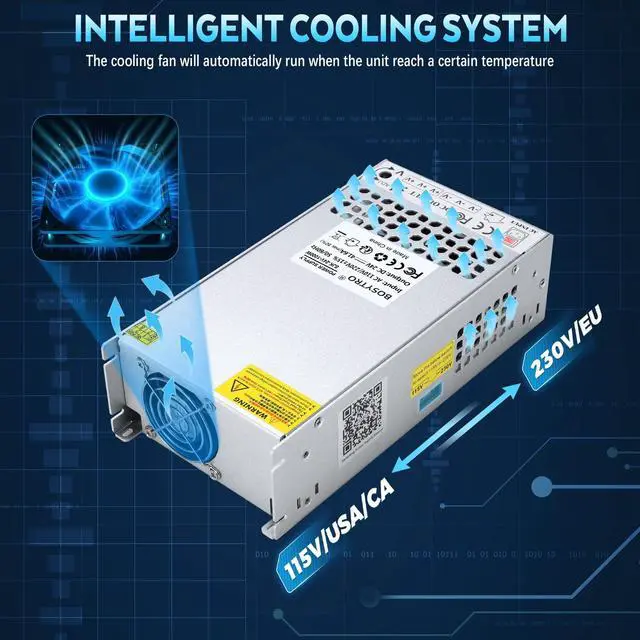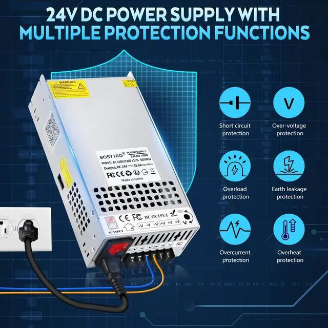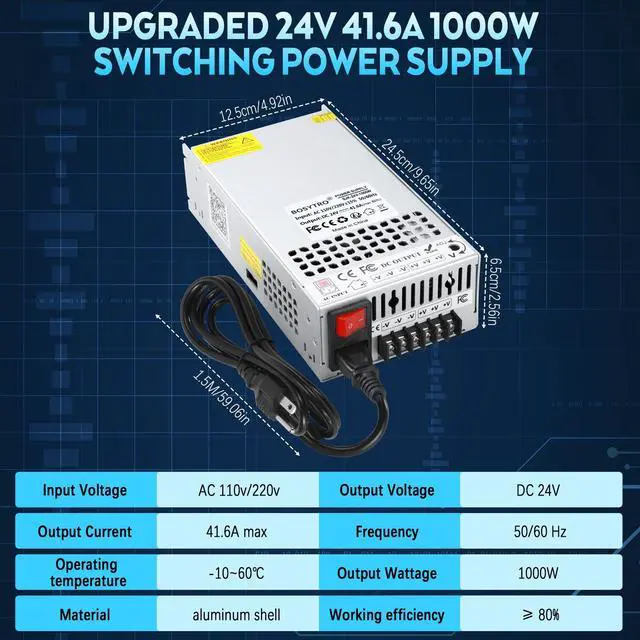 Adjustable range: 10%, Adjustable voltage range is 21.6V - 26.4V, which greatly extends its application range and can provide up to 800 watts of maximum power with an efficiency of up to 80%. When connecting equipment with high peak variations, such as motors, please select a power supply at least 2 greater than the rated power of the equipment to ensure safety. ^^ AC/DC 24V Power Supply2. 24 volt power supply, Three output channels are available to supply power to multiple load devices. The new BOSYTRO power supply has upgraded its output port, added a power port and power cord, Installation bracket+connection terminal accessory packageeliminating the hassle of having to match a separate power cord and making the connection easier and faster. ^^ Good Heat DissipationThe power transformer is made of porous metal aluminum material, low noise and good and stable heat dissipation. The 1000W power supply with intelligent temperature control fan, only to reach a certain operating temperature when the fan will run, in order to prevent the converter overheating and failure; The operating temperature range of this switching power supply: 14-140. ^^ Multiple Protections24 Volt 41.6A 1000W dc power supply is strictly tested before leaving the factory, smart chip provides overload auto power off/over voltage auto power off/over heat auto power off/short circuit protection, 110v to 24V converter is RoHS/CE/LVD/EMC safety certified; lead-free process, meets the environmental protection RoHS requirements; provides effective protection for your power safety. ^^ Input Voltage 115V/230VThere is a voltage switch on the side of the 24v dc transformer, we set 115V for American customers at the factory, before using, please check whether the input voltage is 115V, please switch to the local country's voltage to use; to avoid the voltage mismatch damage to the power supply equipment. ^^ Wide Applications The unit converts AC mains power to low voltage DC 24V with a peak power of 41.6A 1000watts, which works perfectly with most 24V devices under 1000 watts, such as LED strips, 3D printers, ham radios and more. LED power supply will automatically output 0~ 33.3A to match your device, the actual current depends on the load, such as 5A (120W), 10A (240W), 15A (360W), 20A (480W), 25A (600W) 33.3A (800W).