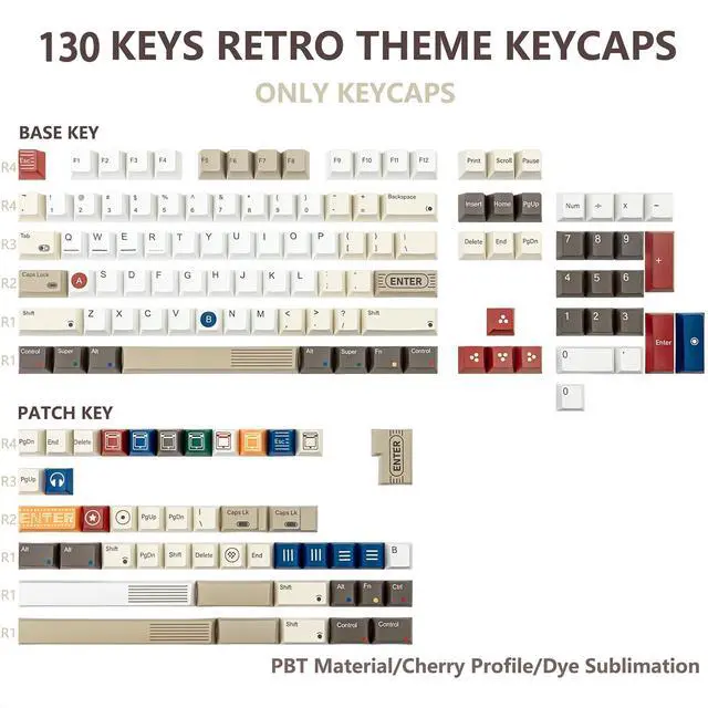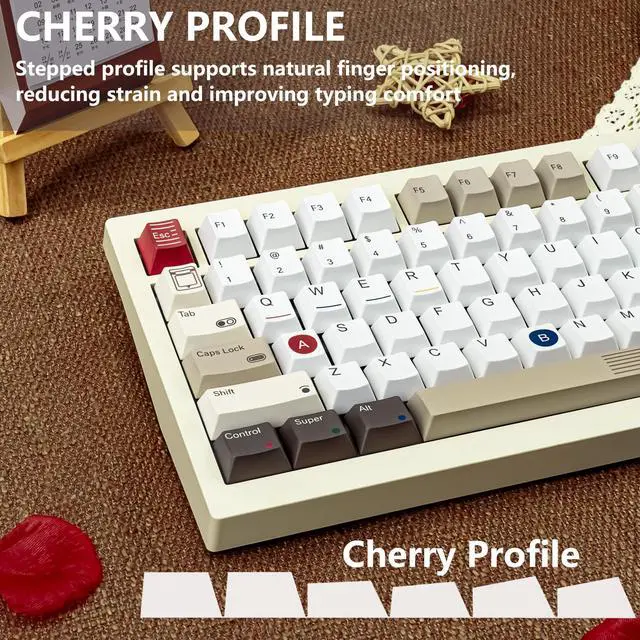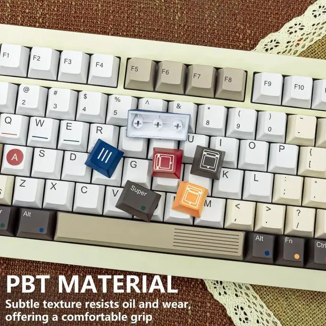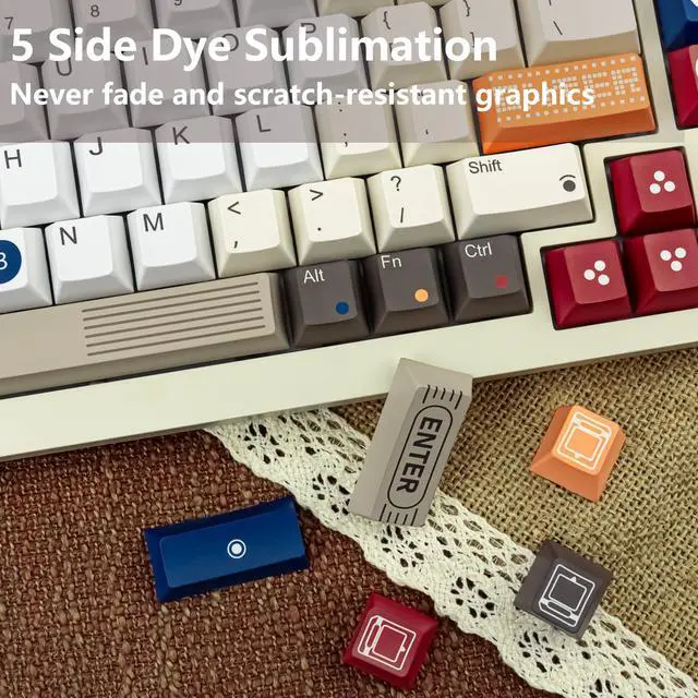 Warm TipsOnly keycaps, not include keyboard. Featuring a warm, retro color palette of beige, brown, orange, and blue, these keycaps transform your keyboard into a functional and retro style, immersing you in nostalgia with every keystroke ^^ Never FadeEvery legend, symbol, and intricate graphic is printed using premium 5-side dye-sublimation. This ensures the vibrant colors and crisp details on the keycaps' top and sides will not fade, ensuring your setup stays iconic ^^ Premium PBT FeelThe high-quality, thick PBT keycaps offer a satisfyingly textured, non-greasy feel that resists shine and wear over time, providing durability and a consistent sound profile ^^ Typing ComfortDesigned with the Cherry profile keycaps, offering a familiar, sculpted curvature that naturally fits your fingertips.
