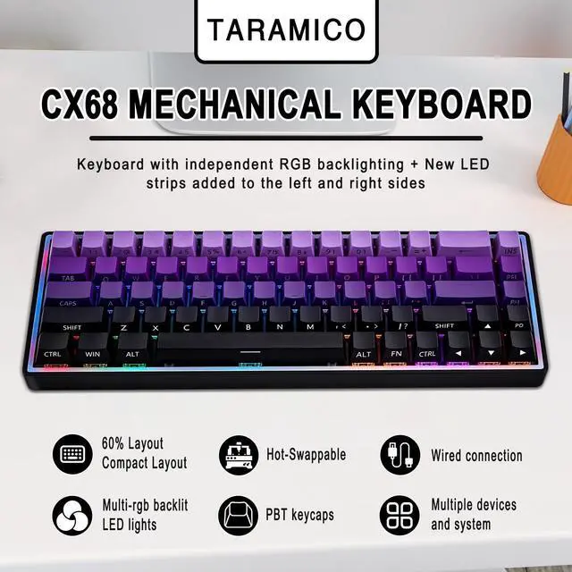 Compact 68-Key Mechanical Gaming Keyboard Designed with a space-saving 68 key mechanical keyboard layout, this compact mechanical keyboard frees up desk space while keeping essential keys for FPS, MOBA and daily typingideal for minimalist setups and competitive gamers. ^^ Custom Mechanical Switches for Fast Response Wired Keyboard Built with responsive mechanical gaming switches, delivering crisp tactile feedback and ultra-fast actuation for precise keystrokes, helping gamers react quicker and type more accurately during intense gameplay. ^^ Vibrant RGB Backlit Pc Gaming Keyboards with Side GlowKeyboard gaming featuring dynamic RGB backlit keyboard effects with immersive edge lighting, customizable lighting modes enhance your gaming atmosphere and visibility in low-light environments for an elevated desktop aesthetic.