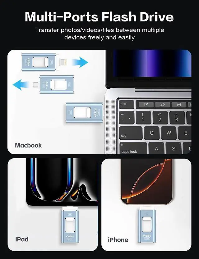 (Note: For iPhone/iPad No App Required; For Android only Needs OTG Enabled, No Extra App. ) ^^ Blazing Fast Transfers AnywhereEquipped with upgraded high-speed chips, this portable phone external storage flash drive lets you transfer massive files in secondsno WiFi, no data cables needed. Save time when sharing photos or moving large video projects, whether youre traveling, working, or creating content. ^^ Universal Compatibility with Dual InterfacesFeaturing USB-C, USB-L, USB ports adapter, this Compatibility iPhone photo storage stick connects seamlessly with iPhone/iPad devices, Android OTG phones, laptops, and tablets. No iCloud fees, no internet requiredjust plug in and move files freely between your phone, computer, and other devices. ^^ Easy to Backup, Enjoy AnywhereEasy to use, plug and play. With just one click, you can quickly back up videos, photos, contacts, and documents, eliminating tedious copying and pasting. Simply plug in your iPhone, iPad, or Android phone. Files are saved directly to the iPhone storage, freeing up valuable space. You can also share files directly from the photo stick for iphone to social media with one click, instantly sharing moments with friends and family.