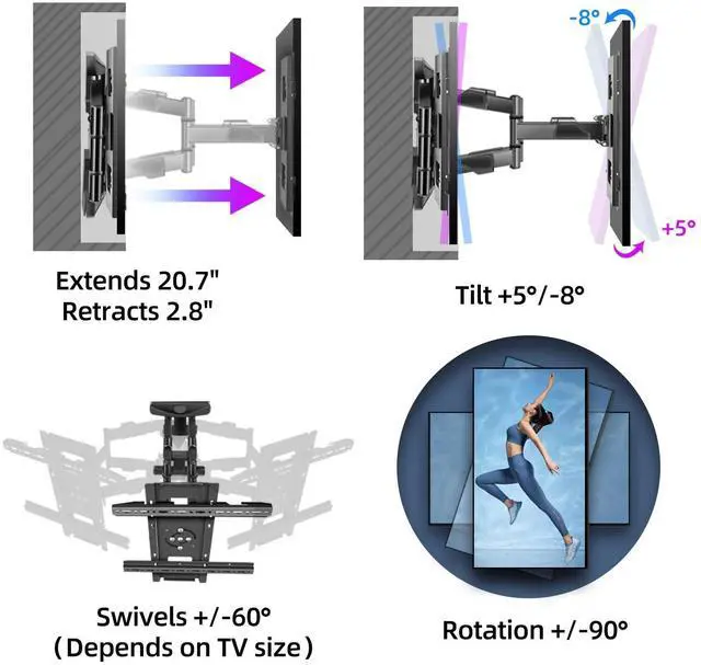 Lock Function): The full motion tv wall mount is fully adjustable to your comfortable viewing angle for a high quality viewing experience, Rotation +/-90, swivels +/-60 without tools, tilts +5/-8 to reduce glare, extends up to 20.7 inches (526 mm) and retracts to 2.8 inches (71 mm) can both adjust the viewing distance and save space ^^ Tough and