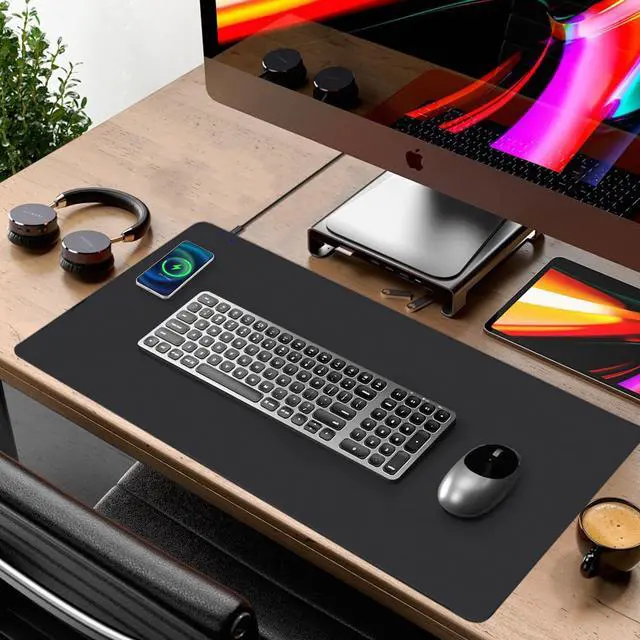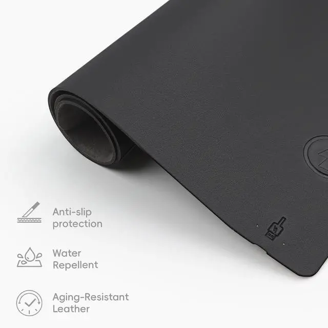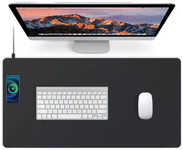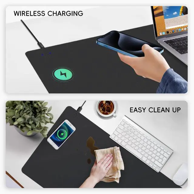 Desk Mat with Wireless Charger, PU Leather Fast Charging Gaming Mouse Pad, Waterproof Anti-Slip Surface, Easy Clean Office Table Mat, 36L x 17W x 0.15H inches, Black (Left Side Charging Port)