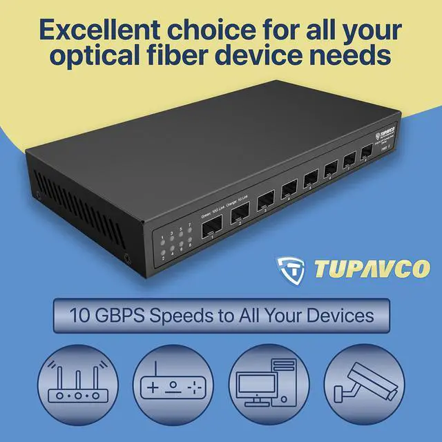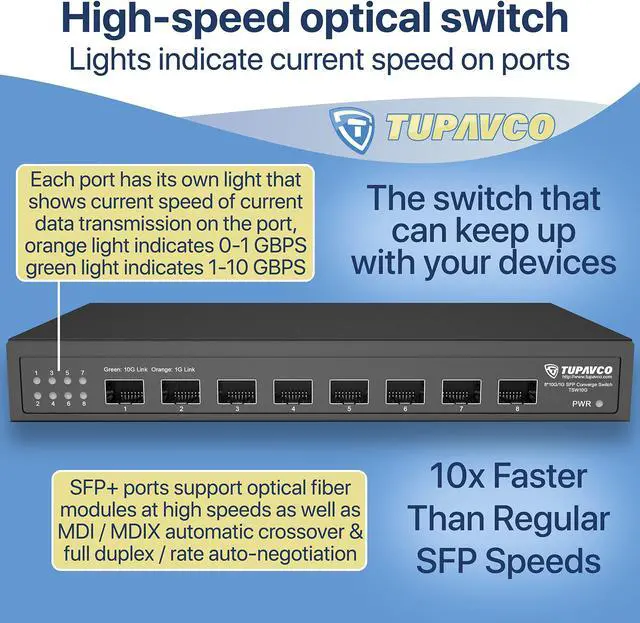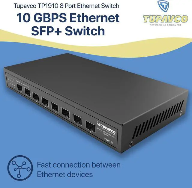 10GB SFP+ Switch (8 Port - Unmmanaged) - 10 Gigabit Ethernet at 8 Small Form-Factor Pluggable Slot for Fiber Optic (Optical Cable) Network or LAN (RJ45/CAT6+) Transceiver Devices - Tupavco TP1910