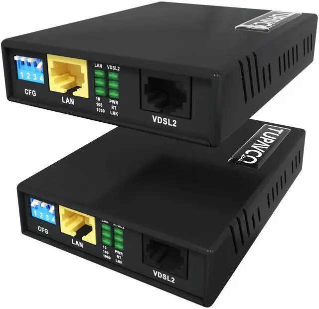 [ETHERNET EXTENDER] Increases Effective range of network cabling from 300ft limit to over 5000ft providing long range, high speed connection up to 300Mbsp ^^ [COST EFFECTIVE] Device can use already existing Phone (VDSL2) or Network cabling (Cat5 Cat6) removing the need for expensive upgrades. ^^ [ADAPTABLE] Tupavco TEX200 is equipped with 4-position DIP switch offering 8 different profile settings ^^ [CLEAN SIGNAL] Supports G. INP making broadband signal significantly less sensitive to noise and interference maximizing speed. ^^ [PLUG-and-PLAY] Very easy to use with no software installation needed. Out of the box ready. Standard RJ45 ports equipped with LED indicators for status monitoring.