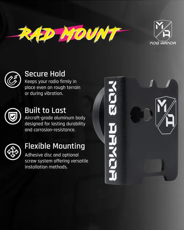 Long Haul: Crafted from 5052 aluminum alloy, the Mob Armor Rad Mount ensures durability. Ideal for off-road adventures, our mount also includes rubber pads to absorb shocks, protecting your handheld radio devices from everyday use.