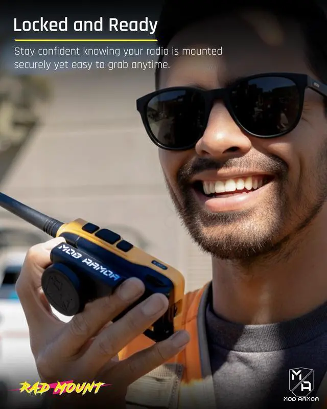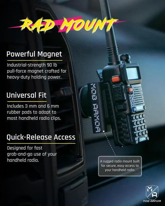 Outdoors: Created by off-road enthusiasts, the Mob Armor Rad Mount withstands tough environments. Whether navigating wild terrains or working on rugged job sites, our magnetic car mount keeps your radios locked-in and accessible.