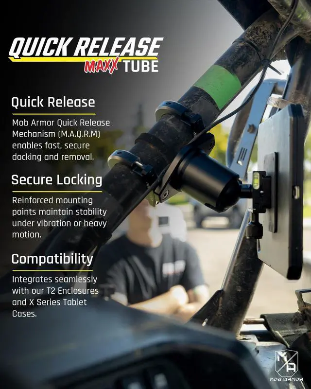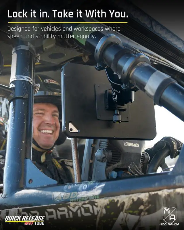 WIDE APPLICATION: Allows you to lock your Mob Armor T-Series Enclosure in your vehicle. Great for UTV's, Trucks or anywhere a tablet is needed with a roll bar or other tube mount location. Easily removed using a tension release know.