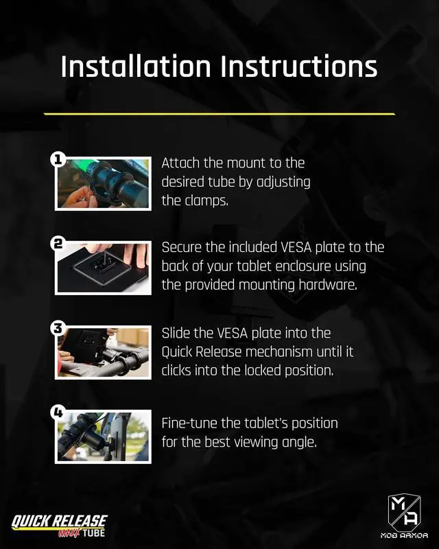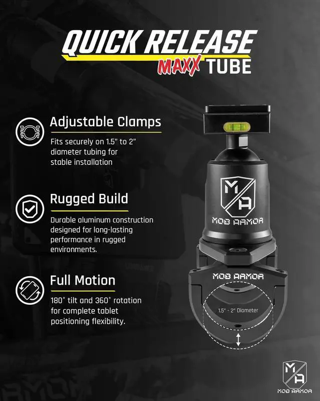 EXCELLENT TABLET MOUNT: The Quick Release Maxx Tube Mount is Mob Armor's solution for instant tablet mounting on tubes and roll cages. It's the perfect tablet mount for a rail, roll cage, and where a suitable tube is available. The tube clamp mounting option clamps to tubes sized from 1.5" to 2.0. " ^^