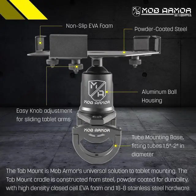 EXCELLENT TABLET MOUNT: The Tab Mount Maxx Tube Mount is Mob Armor's solution for tablet mounting on tubes and roll cages. It's the perfect tablet mount for a, pipe rails, roll cage, and where a suitable tube is available. The Tab Mount Maxx Tube Mount features two adjustable clamps capable of mounting to tubes and roll cages sized 1.5" to 2.0" ^^