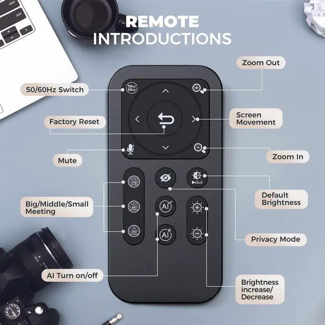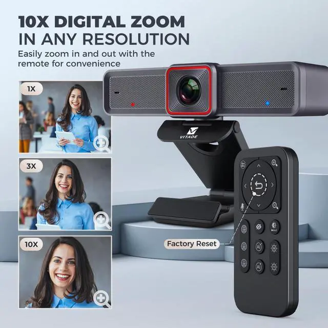 ^^ Zoomable Webcam with RF 360 And 10X ZoomControl your video calls with a remote, with10X digital zoom, AI function, One-key mute, Adjust white balance and more. Higher operability, practicality and fun. Control your video calls with a remote so even away from the desk you are still in charge.