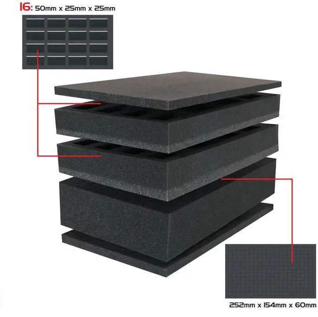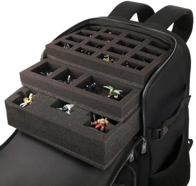 • MINIS BARRACKS House your collection of PCs, NPCs, monsters across 3 integrated miniatures foam trays: 16-slot tray for 28mm figures, 8-slot tray for medium figures, and a customizable foam tray