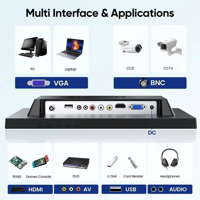 Multi-interfaces: This monitor is equipped with HDMI, AV, BNC, and VGA ports, you can connect it to Raspi, compute, PC, CVBS camera, and so on. In addition, it has a USB port, that you can play the U-Disk directly ^^