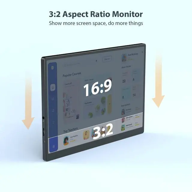Super Bright and Crisp ImageThe picture is INCREDIBLY bright and lives up to its 420-lumen claim. We've deliberately designed this lovely display to be easily usable even in daytime. With a 1920x1280 resolution and 100% sRGB color gamut, the screen delivers stunning, fabulous visual enjoyment that feels true to life. Colors are vibrant and highly accurate, while the viewing angle is excellent and nearly horizontal. ^^ Expanded Screen, Enhanced EfficiencyWith a 3:2 aspect ratio, this laptop monitor offers roughly equal length and height, yet remains taller than it is wide.