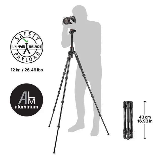 The tripod is kitted out with Manfrottos advanced 496 head, a portable and powerful head that combines versatility and firmness with a great load capacity- safety payload (holds up to 12kg / 26.46 lbs) and independent panoramic and friction knobs for full movement control. Framing with zoom lenses is now easier and faster. The M-lock enhances the Befrees vocation as a support solution designed for rapid and secure performance on the move. The Befree GT XPRO also features the unique 200PL-PRO plate, made of a high-quality aluminium body, and fully compatible with Manfrotto RC2 & Arca-Swiss type head attachments: with 2 rubber inserts that maximise grip, even on the most angled shots. The Befree GT XPRO Aluminium travel tripod is 43cm when folded and fits perfectly in its dedicated carry bag and every kind of hand luggages.