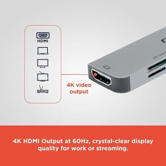 All-in-One Connectivity Solution: Expands your devices capabilities with 7 ports: HDMI 4K@60Hz, SD/Micro SD card slots, dual USB-A (5Gbps & 480Mbps), Type-C data port, and 100W PD charging. ^^ High-Definition 4K