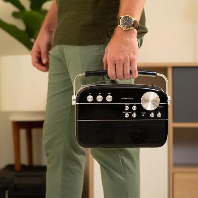 ^^ Portable and Convenient: Rechargeable battery, built-in antenna, and carry handle make it perfect for on-the-go listening.