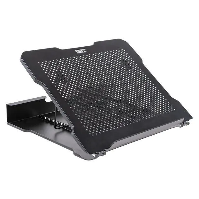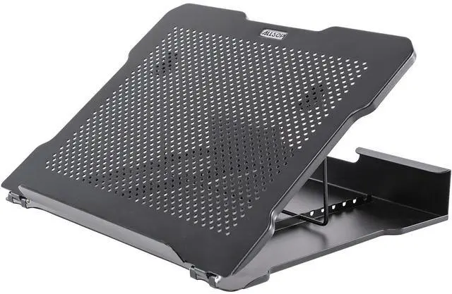 Laptop stand features an adjustable design with six angle options to provide a comfortable way to view your laptop or tablet. Large construction provides ample space for your device to keep it securely positioned. Ventilated structure allows air to flow freely to prevent your device from overheating. Plus, this laptop stand folds to a more compact size for convenient storage.