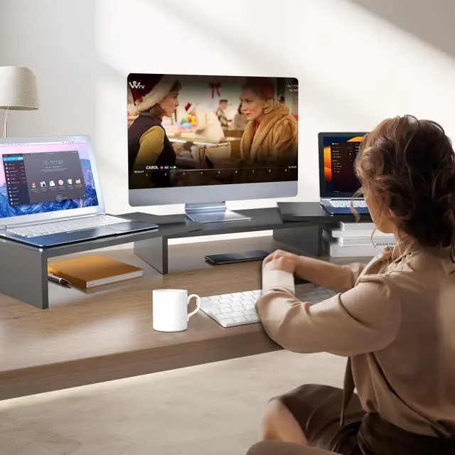 PRODUCT PROFILE - 3 Desk Shelf Monitor Stand Riser dimensions 42.5x 235 x 4.1 inch (L*W*H), great for home or office, it can be used as a 2 monitor stand/riser, 3 monitor stand/riser, printer stand, riser for computer monitor, PC tower stand, laptop shelf, TV stand or even a desk shelf/organizer, also can be used as a shelf to hold books, manuals, magazines, desk accessories, framed photos, and so on. Total weight capacity up to 44 lbs.