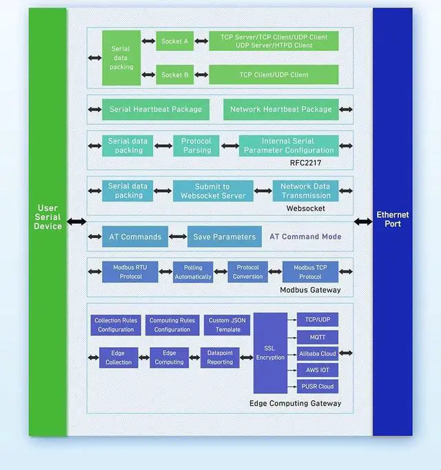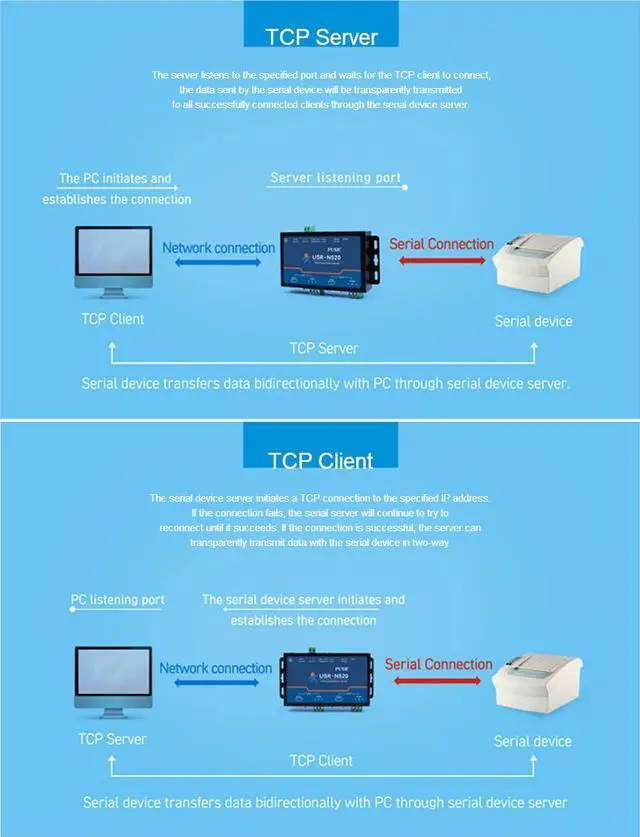 TCP Server, TCP Client, UDP Client, UDP Server and HTTPD Client work mode