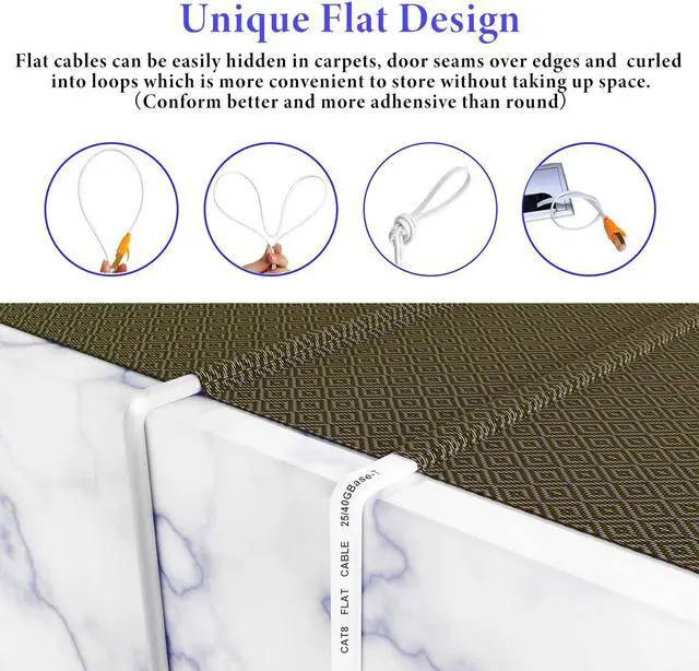 Space Saving: Cat 8 RJ45 cable adopts optimized flat shape design, easy to install, more flexible and perfectly fit the corner, it can b