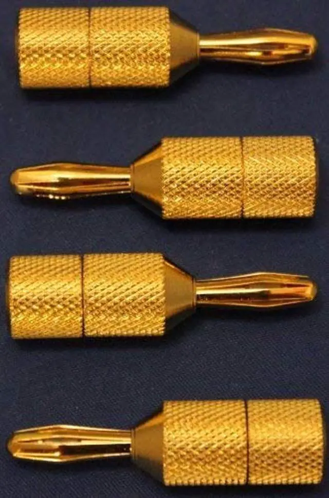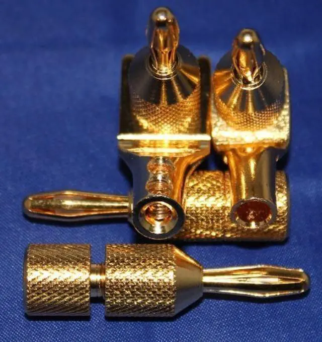 We have available audiophile quality gold plated spade to banana adapters, sold as packs of 4. These are perfect if you currently have speaker cables terminated with spades, need high-quality bananas, and don't want to physically re-terminated them. Pictures demonstrate how both a universal spade (6-9mm opening) and standard spade (6mm) fit into the adapter (spades are not included).
