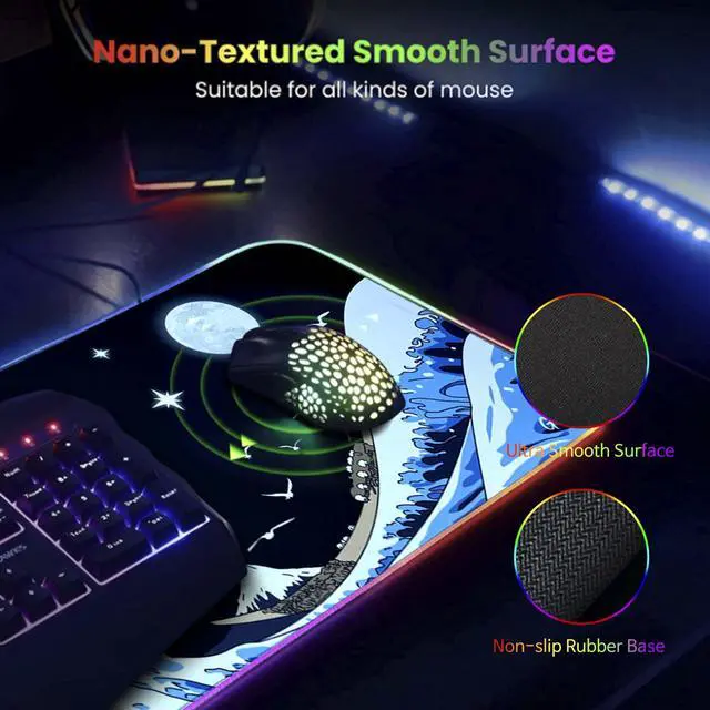 Nonslip Rubber Base : This mouse pad features a non-slip base made from high-elastic natural rubber, providing exceptional grip on any surface. This rubber is non-toxic and free from harmful substances, ensuring it is safe for prolonged use. It keeps the mouse pad firmly in place, even during the most intense gaming sessions, providing a stable and comfortable gaming experience