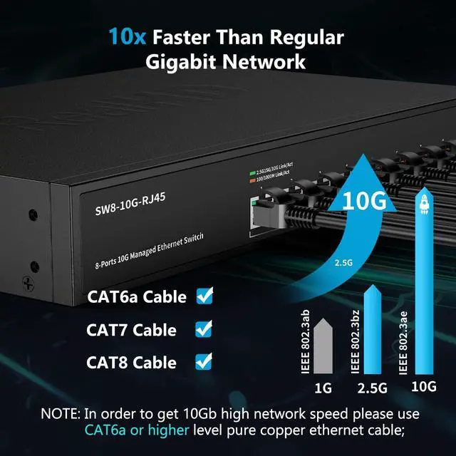 [ 10G Super-Fast & Multi-Gigabit ] This 10 gigabit switch features 8 x 10G RJ45 ports with 160Gbps switching capacity, providing higher-speed connectivity for your devices and allowing you to easily upgrade your network to support the latest 10G ethernet standard. Also compatible with 5G/ 2.5G/ 1000M/ 100M devices and speed auto-negotiation with LED indicator. NOTE: 2.5G speed with Cat5e or above copper cable, 10G speed with Cat6/ Cat6A or above copper cable.