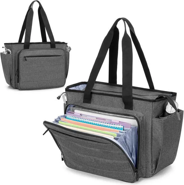 CURMIO Nurse Tote Bag for Women, Portable Medical Supplies Shoulder Bag with A4 Size Accordion File Organizer Compartment and 15.6 Laptop Sleeve for Nursing Work, Home Health, Gray(Patent Pending)