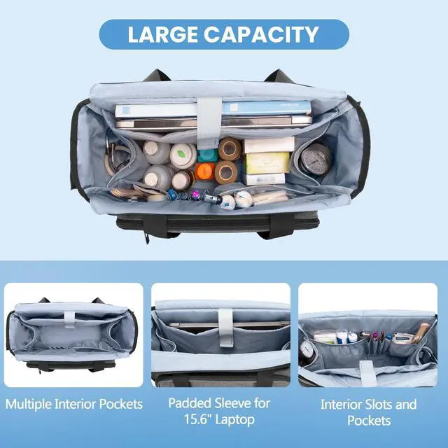 MAIN COMPARTMENT: Main compartment has plenty of room for organizing medical supplies, such as penlight, thermometer, stethoscopes, blood pressure cuffs, etc. The soft padded sleeve for iPad or a laptop (up to 15.6 inches).
