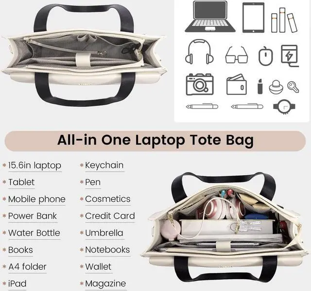 Ideal Organizer Work Tote:The work bags for women come with multi-compartments to meet all your work needs well. The laptop tote bag has an independent laptop compartment fits under 15.6 inch laptop and Ipad/tablet,a large main middle pocket designed for documents, book and gadgets,two small square pockets, two pen pockets,There has two side-pocket for power bank and water bottle inside.Stylish outer pocket with magnetic buckle,two zipper pockets and an anti-theft pocket,Easy access to items.