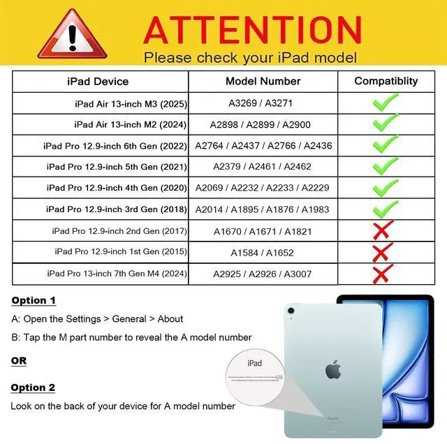 [COMPATIBILITY] Designed for New 2025 iPad Air 13 inch M3 - Model: A3269/A3271, 2024 iPad Air 13 inch M2 - Model: A2898/A2899/A2900, 2022 iPad Pro M2 12.9 inch(6th Generation) - Model: A2764/A2436/A2437/A2766, 2021 iPad Pro 12.9 inch(5th Gen) - Model: A2378/A2379/A2461/A2462, 2020 iPad Pro 12.9 inch(4th Gen) - Model: A2229/A2069/A2232/A2233, 2018 iPad Pro 12.9 inch(3rd Gen) - Model: A1876/A2014/A1983/A1895. NOT fit any other iPad models