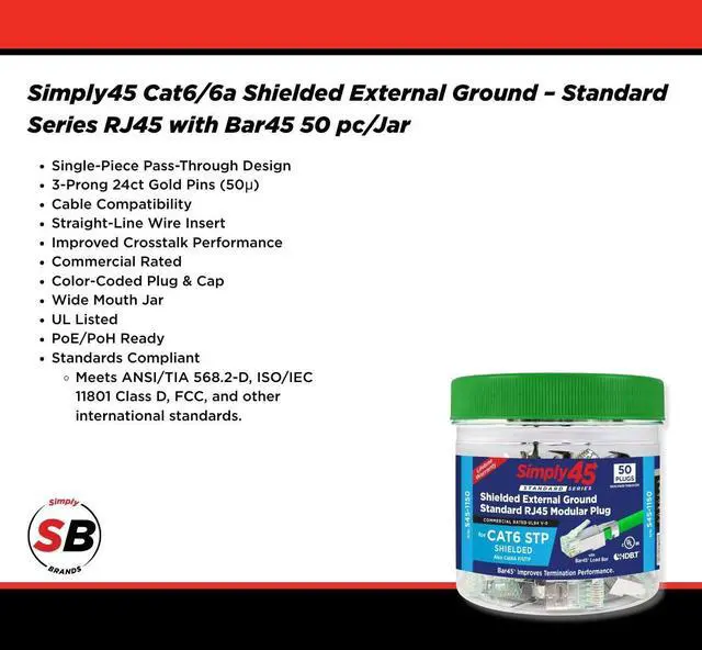 PoE/PoH Rated - The S45-1150 uses the correct 3-Prong Pin design; true 24ct gold plated pins; fully shielded and is made using the highest quality materials for RJ45 modular plugs.