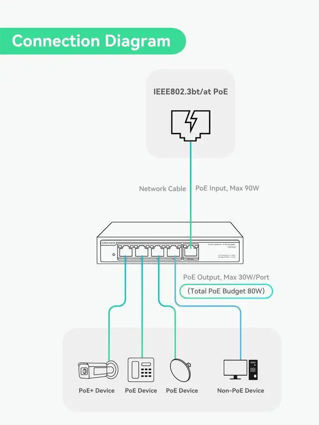 LINOVISION 4 Ports Gigabit PoE Passthrough Switch and PoE Extender with 90W PoE Input, IEEE802.3af/at/bt PoE Repeater, 1 in 4 Out POE Bosster, PoE Powed Switch for IP Cameras, IP Phone