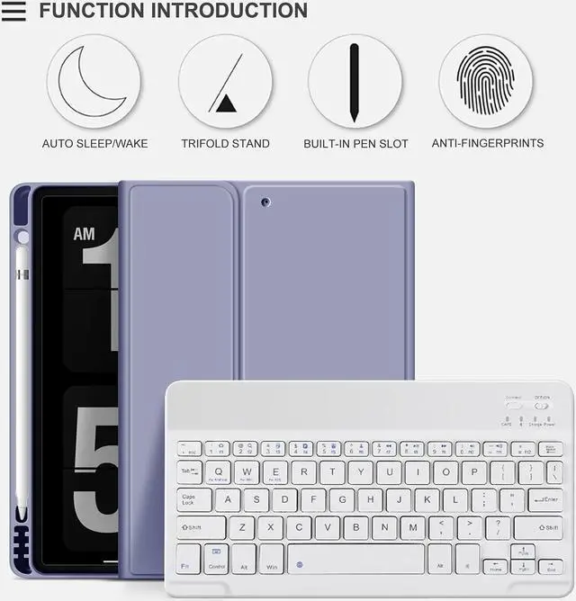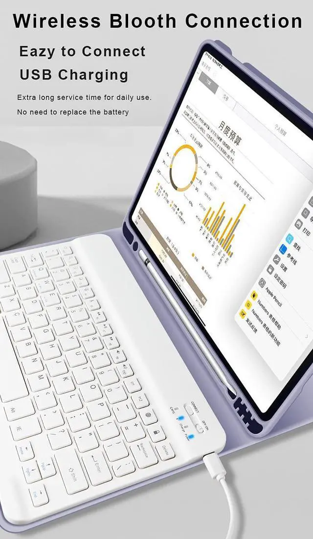 Bluetooth Wireless Keyboard Case- Magnetic compact wireless Bluetooth keyboard, easy to install and remove, can be securely attached to the case, instantly become a portable laptop. Built-in rechargeable battery, charging for 2 hours, working for more than 3 days. Keyboard design using scissor-cross low profile structure, enhance the tactility of typing, let you faster and easier to learn and work. Easily prop up your iPad with standing position for enjoy the most comfortable flexible angles.