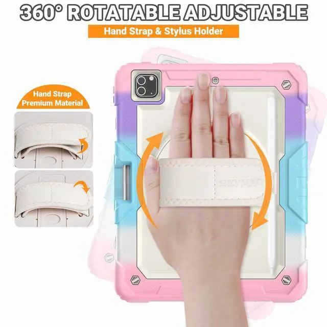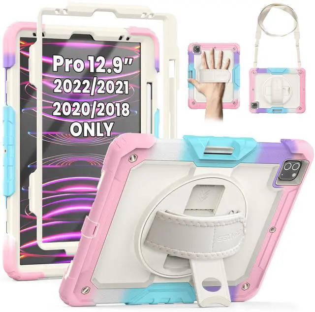 SEYMAC Kids Case for iPad Pro 12.9 2022/2021/ 2020/2018, Heavy Duty Protection Shockproof Case with Screen Protector, Rotating Stand/Handle/Shoulder Strap, Supports Pencil 2 Charging, Beige Pink
