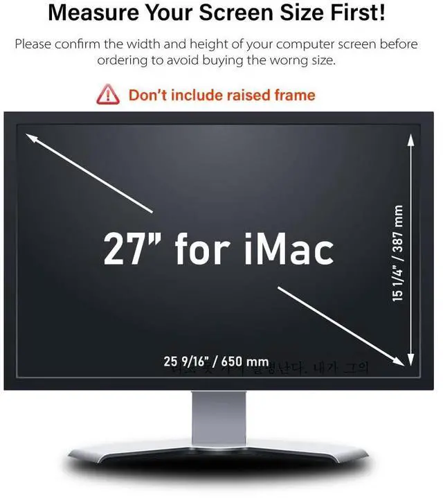 Perfect Fit With 27 Iinches Diagonally Measured - Apple iMac monitor - Aspect Ratio 16:9 - Filter Size: Width: 25 9/16 inches, Height: 15 1/4 inches (650mm x 387mm). Contact us if you have any questions about dimensions.