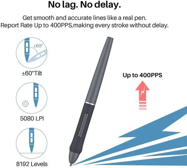 8192 level pressure sensitivity helps to get natural and smooth lines. 400 PPS report rate, making each stroke without delay. Supports 60 ° Tilt, which means even if the pen is tilted, the cursor is still tracing to make each line accurate. In sketching, using this digital pen is just like holding a real pencil, easy to paint shadows. The pen is battery-free, no need to charge the pen