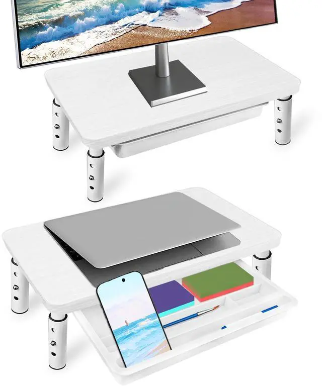 STORAGE DRAWER - The monitor stand with drawer has a phone/ipad holder, a pen/stationery slot in the middle, and two storage compartments for gadgets, tabs, post-it notes, and business cards. It makes it simple to store office supplies and accessories, which helps keep your working space clean and neat and is ideal for desk organization.
