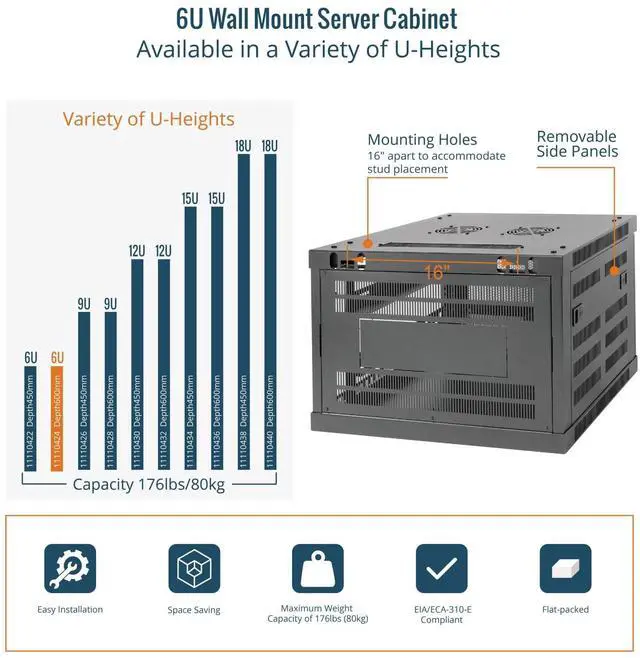 Heavy-Duty Load Capacity: Engineered to support up to 176 lbs wall-mounted and 350 lbs floor-mounted, this commercial-grade 6u wall mount rack is ideal for servers, switches, patch panels, and other high-density IT equipment