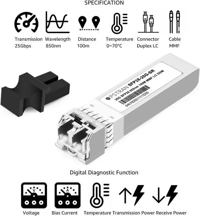 25GBASE-SR SFP28 Optical Transceiver Module 850nm 100m DDM Duplex LC MMF. Built-in high performance Chip, Max. Power Consumption 1W Allowing for Prolonged Service Life, Commercial Temperature Range 0 to 70°C (32 to 180°F)