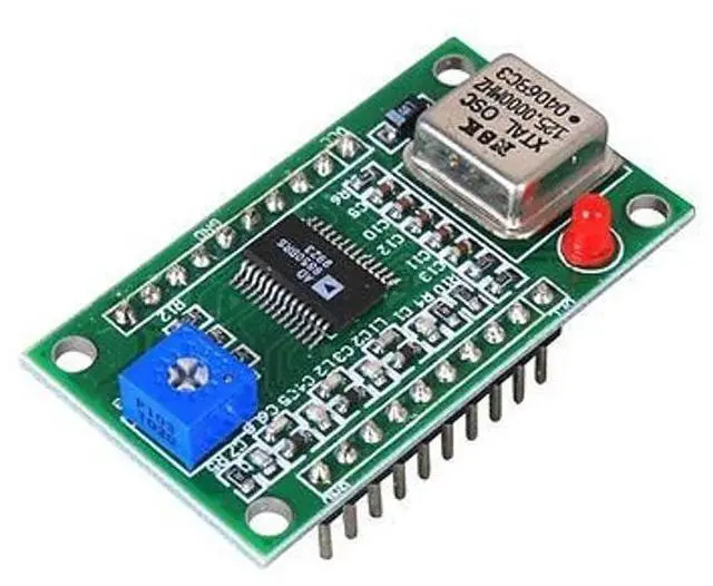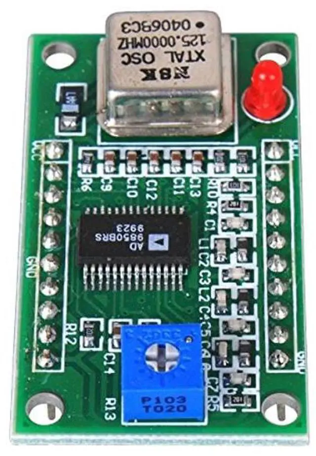 This module is based on the ADS9850 integrated circuit by Analog Devices. It is a full 125MHz CMOS DDS synthesizer. The AD9850 is a highly integrated device that uses advanced DDS technology coupled with an internal high speed, high performance, D/A converter and comparator, to form a complete digitally programmable frequency synthesizer and clock generator. The module is a fully functional device. You will only need to add power and control signals to operate this module.