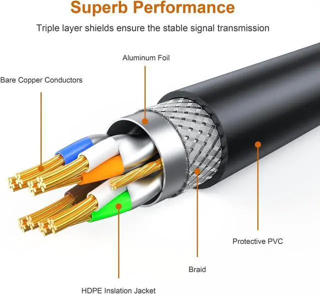Direct Burial Heavy Duty : The Triple layer shieldeds ensure Cat7 Outdoor Ethernet cable is super-efficient in reducing EMI/RFI Interference and provide highest fidelity for long distance data transmission. With upgraded PVC, ethernet cable cat 7 is waterproofed & anti-corrosion and more durable & flexible for heavy duty work. Can be buried directly . Suitable for both indoor and outdoor use