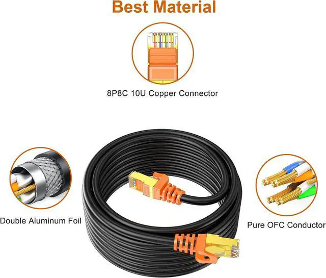 Weatherproof UV Resistant :Buliding with high quality UV-resistant PVC jacket, the outdoor rated Cat7 Ethernet cable is anti-aging. It can withstand direct sunlight and extreme cold & humid & hot weather yet still working efficiently. Premium design with great quality