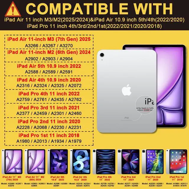 Check Model for iPad: Case compatible with iPad Air 11 inch M3 2025(Model:A3266/A3267/A3270) & M2 2024(Model:A2902/A2903/A2904);Case for iPad Air 5th/4th Gen 10.9" 2022 2020(Model:A2072/A2316/A2324/A2325/A2588/A2589/A2591);Case for iPad Pro 11" 4th Gen 2022(Model:A2759/A2435/A2761/A2762)& 3rd Gen 2021(Model: A2301/A2459/A2460)& 2nd Gen 2020(Model:A2228/A2068/A2230/A2231)& 1st Gen 2018(Model: A1980/A2013/A1934/A1979). Please check the model AXXXX on the bottom back of tablet before purchasing