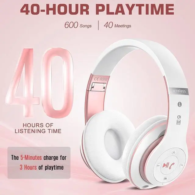 Prtukyt 6S Wireless Bluetooth Headphones Over Ear, Hi-Fi Stereo Foldable Wireless Stereo Headsets Earbuds with Built-in Mic, Volume Control, FM for Phone/PC (White & Rose Gold)
