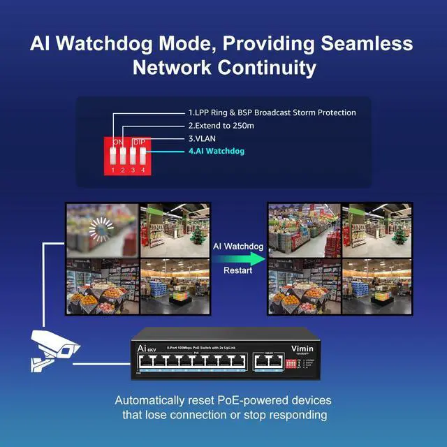 AI Watchdog Mode - This enhanced 10-Port PoE switch features AI Watchdog Mode. This advanced functionality automatically detects and rectifies port issues, guaranteeing uninterrupted power delivery to all connected devices. Elevate your network's security and reliability with seamless operation, ensuring unparalleled performance for your infrastructure.