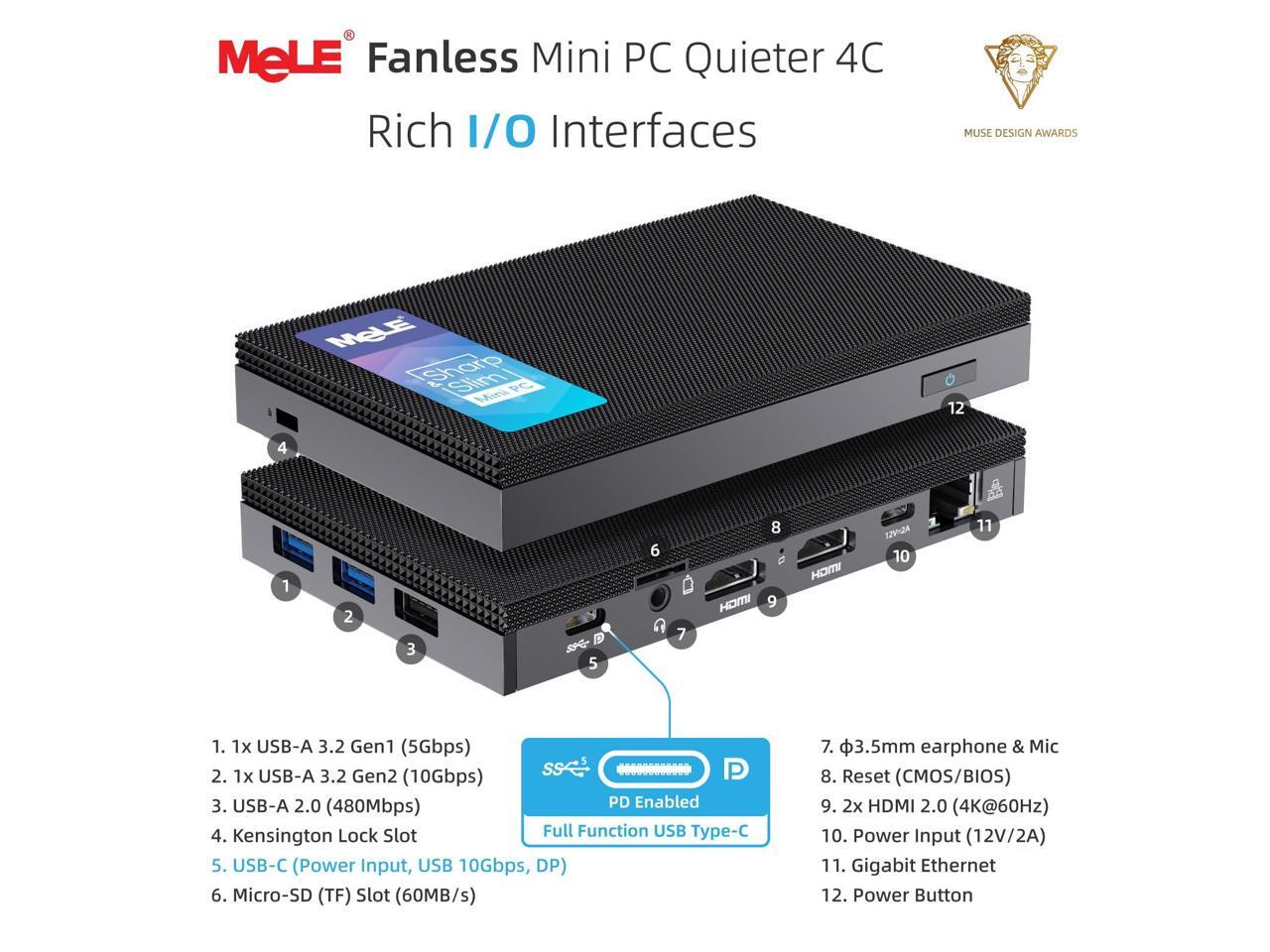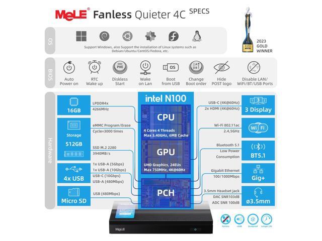MeLE Mini PC Quieter 4C - 12th Gen N100, Fanless PC, 16GB Memory, 512GB Storage,with Windows 11 Pro, 2.4/5G Wi-Fi, Full-Functional USB-C, 4K Triple Display Desktop
