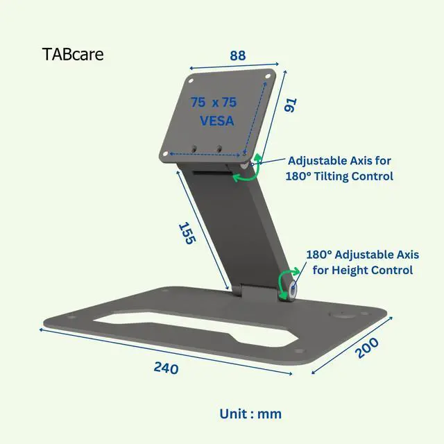Stand supports75x75 VESA, Adjustable two axis design, one for 180° tilting control, the other for height control.
