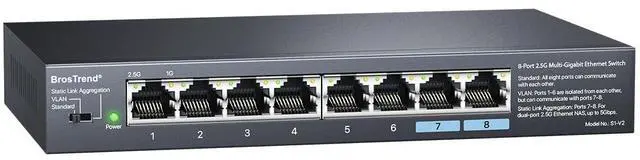 BrosTrend 2.5G b Switch, Unmanaged 8 Port Ethernet Switch 2.5 Gigabit Supports Static Link Aggregation & VLAN, Fanless, Desktop Wall Mount, Multi Gig Splitter for Gaming, NAS, PC, Lifetime Protection